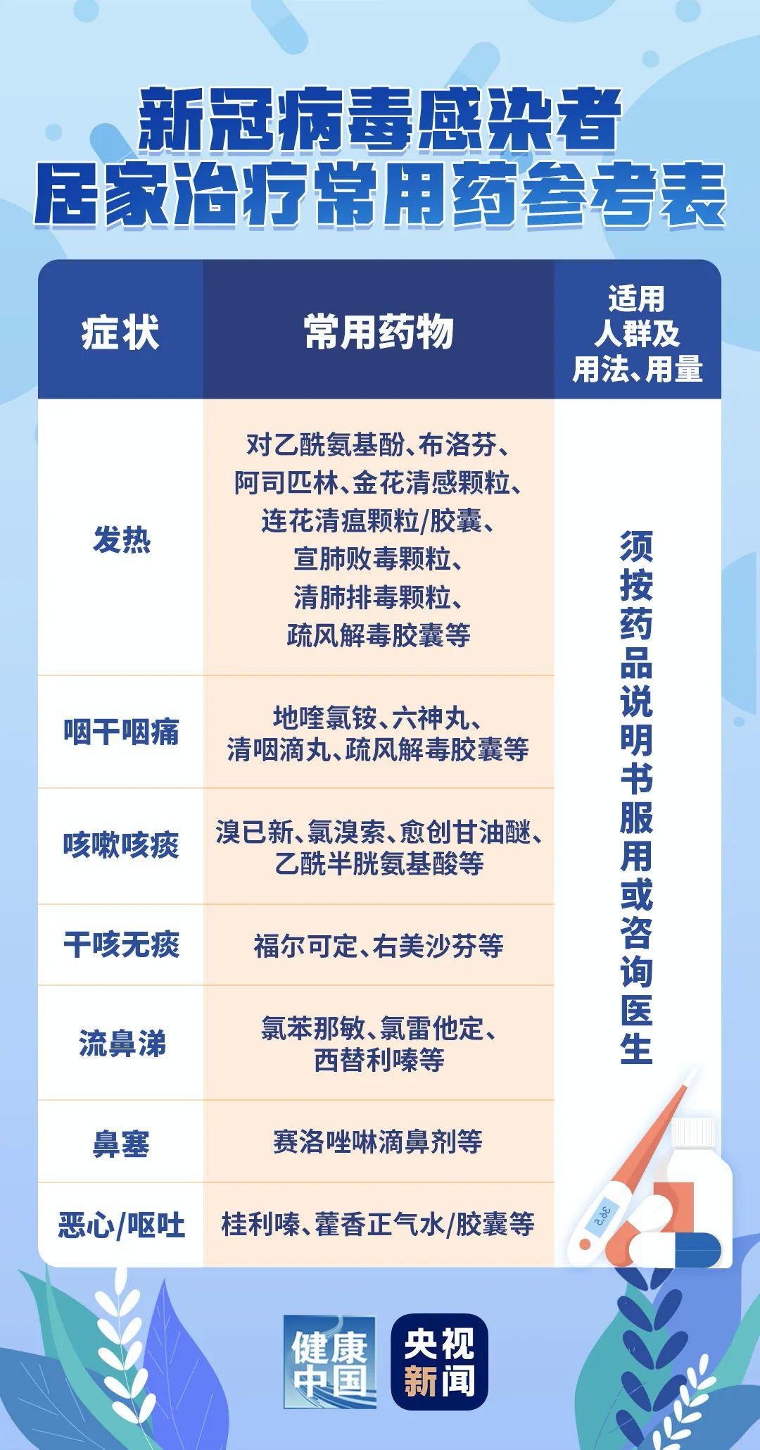 12月8日,央視網(wǎng)轉(zhuǎn)載國家衛(wèi)健委官網(wǎng)發(fā)布新冠感染者居家治療指南。針對可以居家治療的新冠病毒感染者可能出現(xiàn)的7種癥狀推薦了家庭常用參考藥物。圖表如下: